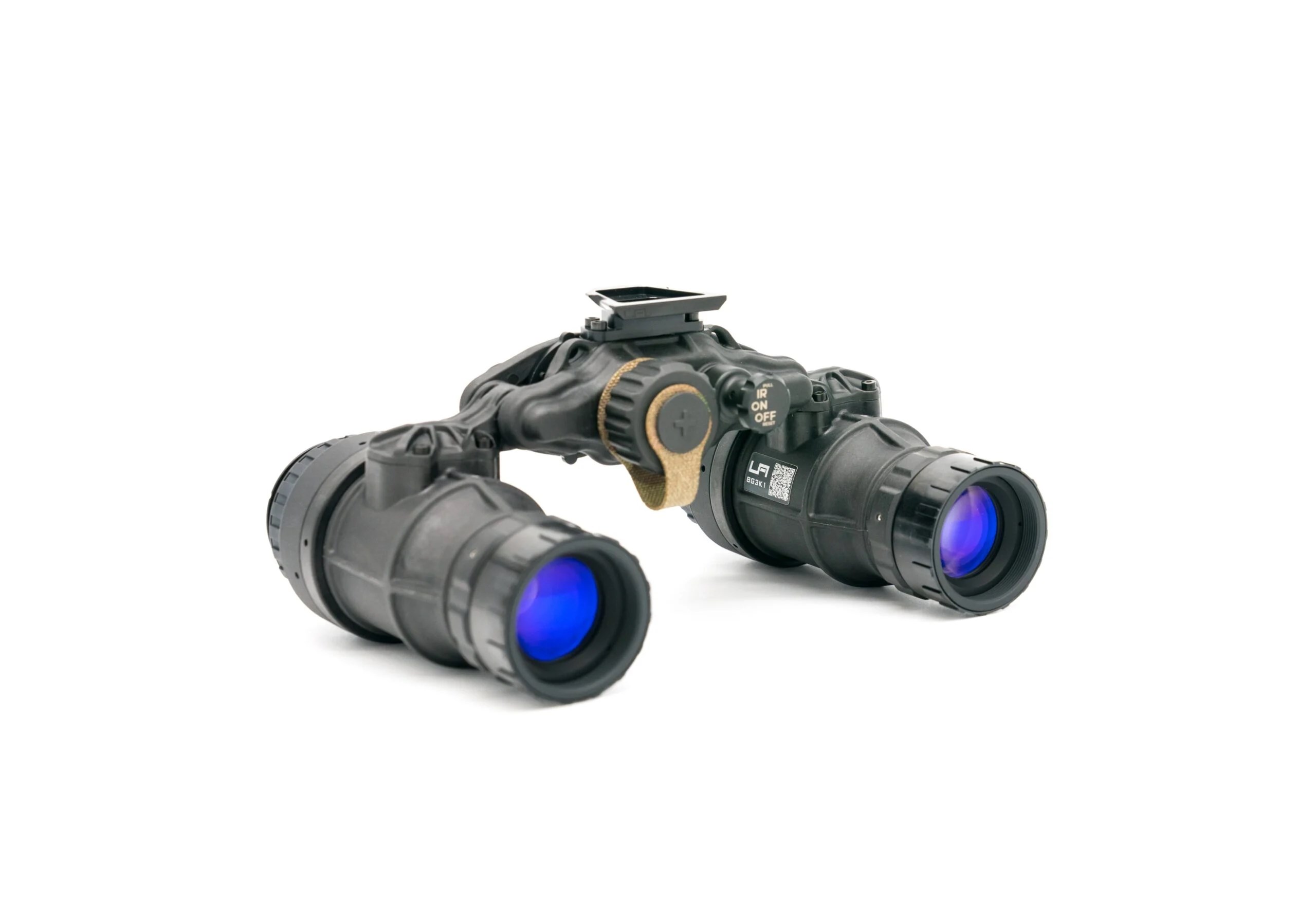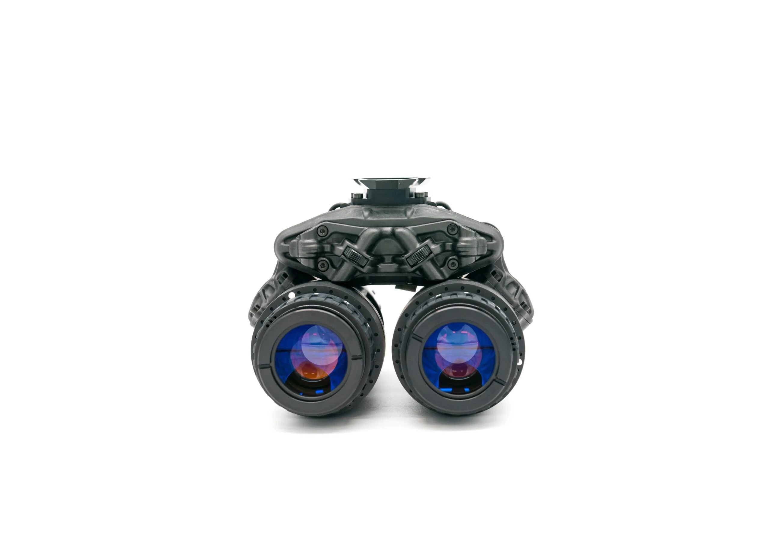 The act in Black DTNVS-MG is a dual tube articulating night vision goggle that features a fiber reinforced polycarbonate housing independent pod shut off when articulated and an onboard IR illuminator with this individual articulation. It gives the user flexibility when to stole their device towards the top of the helmet. The system also features a low battery LED light indicator that adjusts for cold weather temperatures so the low battery indicator offers more consistent readings than other units.Characteristics
