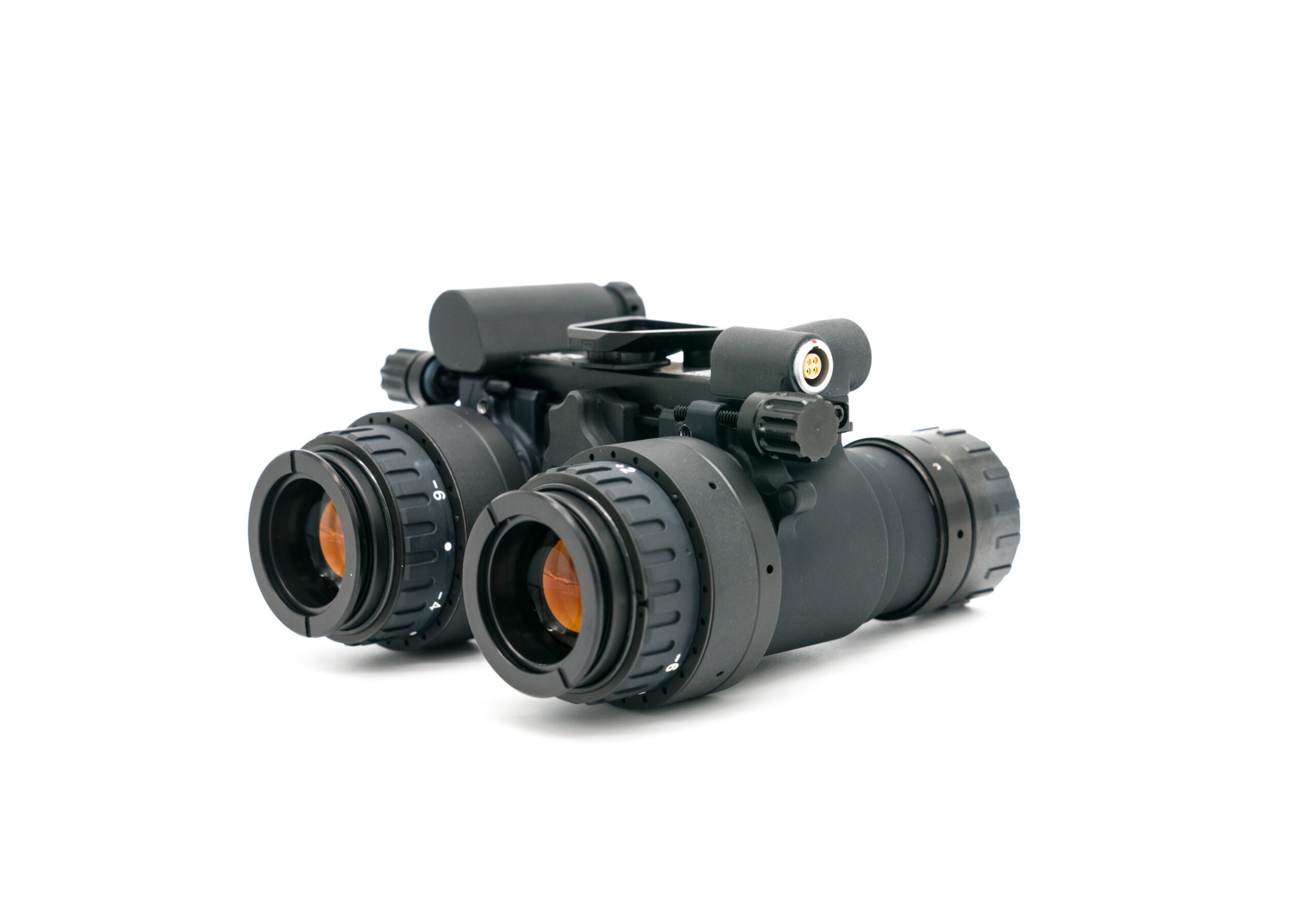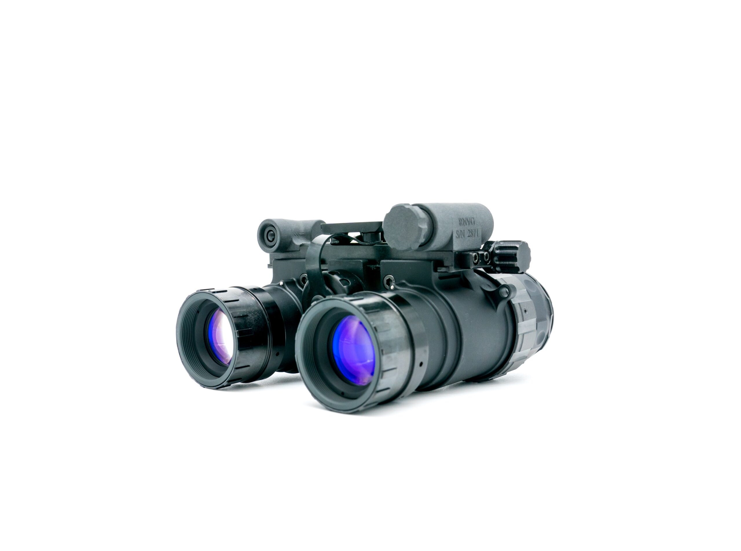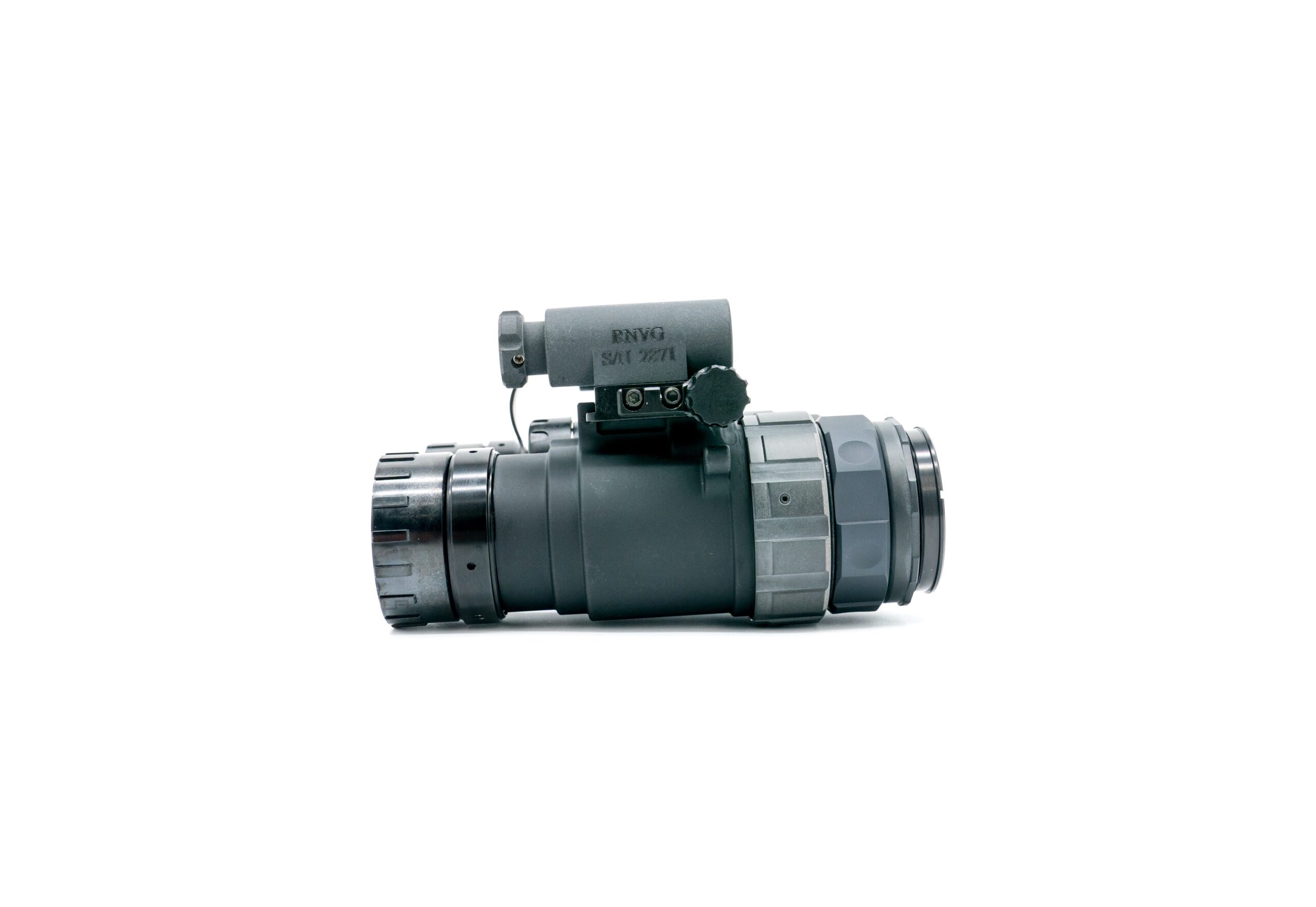 The RNVG (Ruggedized Night Vision Goggle) is a fixed-bridge binocular night vision system built from 7075 aircraft-grade aluminum for exceptional strength and impact resistance. It includes an onboard IR illuminator and an auxiliary power connector. Interpupillary distance (IPD) is adjusted via side screws, allowing precise alignment that stays locked in place for quick, consistent deployment. The goggle can be powered by a single CR123 battery or an external battery pack via a LEMO connector, offering flexible power options while maintaining a rugged, reliable design. ---Characteristics